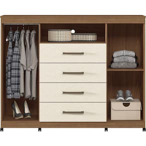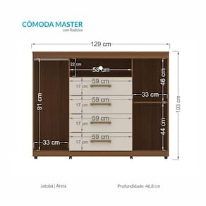 Possui rodízios que facilitam a movimentação do móvel dentro do ambiente. Produto Montado: Sim Acabamento da Gaveta: Pintura Acabamento da Porta: Pintura Acabamento da Prateleira: Pintura Ambiente Principal: Quarto codigo_ean: 7909903490662 Complexidade da Montagem: Baixa: pode ser montado por uma pessoa sozinha Cor: Jatobá/Areia Cor do Produto: Jatobá/Areia Cor Flex: Não Cor Interna: Jatobá Escala de Brilho: Semi-Fosco Escala de Brilho da Gaveta: Semi-Fosco Escala de Brilho da Porta: Semi-Fosco Escala de Brilho da Prateleira: Semi-Fosco Gaveta com Chave: Não Itens Inclusos: 1 Cômoda, Manual de Montagem e Kit Ferragens Linha ou Coleção: Master Manual de Especificação Técnica: https://product-hub-prd.madeiramadeira.com.br/879852/documents/89696ace-000e-4aaf-8665-fcef530a0c101664272309943r.pdf Manual de Montagem e Instalação: https://product-hub-prd.madeiramadeira.com.br/879852/documents/f08d34cc-9e9d-4db5-a66a-a2109120dfa0cd494997409COMODAMASTER2.4.pdf Material da Gaveta: MDP Material da Porta: MDP Material da Prateleira: MDP Material do Fundo: HDF Material do Puxador da Gaveta: ABS Material do Puxador da Porta: ABS Material Principal: MDP Montagem Flex: Não Necessita Montagem: Sim Origem do Produto: Nacional Peso: 48,25 kg Peso Máximo por Gaveta: 2 kg Peso Máximo por Prateleira: 5 kg Possui Espelho: Não Possui Nichos: Não Possui Pés: Não Possui Portas: Sim Possui Prateleiras: Sim Quantidade de Gavetas: 04 Gavetas Quantidade de Prateleiras: 01 Prateleira Recomendações de Uso, Manutenção e Limpeza: Não limpar com álcool ou qualquer outro produto químico. Utilize somente pano seco ou levemente umedecido. Sapatas Niveladoras: Não Sistema de Montagem: Parafusos, Cavilhas e Girofix. Suporta Até (kg): 30 kg Tipo de Corrediça da Gaveta: Metálica Simples Tipo de Dobradiça/Corrediça da Porta: Metálica Tipo de Porta: Bater Tipo de Puxador da Gaveta: Externo Tipo de Puxador da Porta: Externo