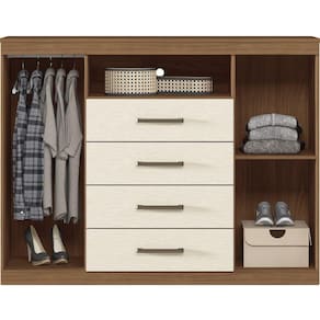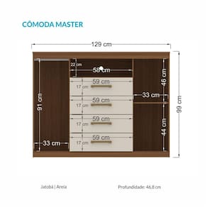 Esta cômoda Master da Santos Andirá é de um espaço incrível para o seu quarto, seja ele de casal, solteiro ou juvenil! Sem falar em seu design: muito prático. Possui duas portas: uma porta com cabideiro em alumínio, para pendurar: calças, camisas, camisetas...e a outra porta com prateleiras para guardar sapatos, caixas, decoração e demais objetos! Suas 04 amplas gavetas deslizam sobre corrediças metálicas com suavidade para guardar suas roupas com muita organização. E ainda possui espaço para colocar aparelhos eletrônicos e claro...um aparelho de TV sobre o tampo, para sua comodidade (o tampo suporta até 5 kg). O acabamento na cor madeirada é com verniz fosco, tudo dentro dos padrões de preservação do meio ambiente. São muitas funções em um só móvel!!! Todo o quarto precisa ter essa cômoda Produto Montado: Sim Acabamento da Gaveta: Pintura Acabamento da Porta: Pintura Acabamento da Prateleira: Pintura Ambiente Principal: Quarto codigo_ean: 7909903490600 Complexidade da Montagem: Baixa: pode ser montado por uma pessoa sozinha Cor: Jatobá/Areia Cor do Produto: Jatobá/Areia Cor Flex: Não Cor Interna: Jatobá Escala de Brilho: Semi-Fosco Escala de Brilho da Gaveta: Semi-Fosco Escala de Brilho da Porta: Semi-Fosco Escala de Brilho da Prateleira: Semi-Fosco Gaveta com Chave: Não Itens Inclusos: 1 Cômoda, Kit Ferragens e Manual de Montagem Linha ou Coleção: Master Manual de Especificação Técnica: https://product-hub-prd.madeiramadeira.com.br/879846/documents/ea3b1a28-ce7b-4962-9642-e49d3cb4fe641664239309943.pdf Manual de Montagem e Instalação: https://product-hub-prd.madeiramadeira.com.br/879846/documents/ff9ae3c6-918c-4db7-b8d8-88b2fd043fb6424494997409comodamaster24.pdf Material da Gaveta: MDP Material da Porta: MDP Material da Prateleira: MDP Material do Fundo: HDF Material do Puxador da Gaveta: ABS Material do Puxador da Porta: ABS Material Principal: MDP Montagem Flex: Não Necessita Montagem: Sim Origem do Produto: Nacional Peso: 47,85 kg Peso Máximo por Gaveta: 3 kg Peso Máximo por Prateleira: 3 kg Possui Espelho: Não Possui Nichos: 01 Possui Pés: Não Possui Portas: Sim Possui Prateleiras: Sim Quantidade de Gavetas: 04 Gavetas Quantidade de Prateleiras: 01 Prateleira Recomendações de Uso, Manutenção e Limpeza: Utilizar pano levemente umidecido e flanela Sapatas Niveladoras: Não Sistema de Montagem: Parafusos e Cavilhas Suporta Até (kg): 5 kg Tipo de Corrediça da Gaveta: Metálica Simples Tipo de Dobradiça/Corrediça da Porta: Metálica Tipo de Porta: Bater Tipo de Puxador da Gaveta: Externo Tipo de Puxador da Porta: Externo Ean: 7909903490600