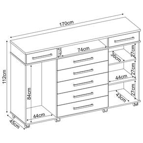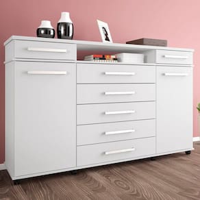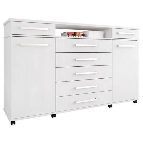 Estar de casa nova é uma delícia, a parte de mobiliar é tão difícil ainda mais se tratando daquele lugarzinho de descanso que mais amamos, mas tem dúvida em qual móvel comprar? Temos uma dica importantíssima!A Cômoda London é um dos móveis mais completo que você pode imaginar para compor seu quarto, o que chama atenção é as repartições que foram bem elaboradas e distribuídas de um jeito funcional. A cômoda vem com 7 gavetas, 2 portas uma com cabideiro e a outra acompanha 2 prateleiras para que suas roupas e pertences ficam mais organizados e acomodados facilitando na hora de se arrumar e um pequeno nicho onde objetos podem ser colocados como decoração, o grande destaque é seu tampo que suporta uma televisão de 50 polegadas.Perfeita para o seu quarto né! Corra e não fique de fora dessa!Dimensões do Produto:Largura: 170 cm.Altura: 112 cm.Profundidade: 45 cm.Peso: 81,90 kg.Características dos Produtos:Material da Estrutura: MDP.Peso Suportado: 5kg por prateleira, 3 kg por gaveta, 10kg base, 8kg tampo.Acabamento: Pintura UV.Escala de Brilho: Brilhante.Possui Pés: Não.Possui Rodízios: Sim.Possui Gavetas: Sim.Quantidade de Gavetas: 7 Gavetas.Tipo de Corrediças: Telescópicas.Possui Portas: Sim.Quantidade de Portas: 2 Portas.Tipo de Porta: Convencional.Possui Prateleiras: Sim.Quantidade de Prateleiras: 2 Prateleiras.Possui Cabideiro: Sim.Possui Nichos: Sim.Quantidade de Nichos: 1 Nicho.Diferenciais:- Design Moderno;- Amplo espaço interno;Sistema de montagem: Parafusos/Pregos/Cavilhas.Manual de montagem: Sim.Complexidade da Montagem: Média.Conteúdo da Embalagem: 1 Cômoda.Volumes: 2 Volumes.Garantia do fabricante: 90 dias contra defeito de fabricação.Montagem: Aconselhamos que seja feita por um profissional.Recomendação de limpeza: Utilize pano levemente úmido.Observações importantes:- Produto para uso residencial em ambiente interno, não devendo ficar exposto diretamente ao sol, calor e umidades excessivas.- Pode haver alguma diferença de tonalidade entre a imagem e o produto real, por conta do tratamento de imagens e a calibração de cores do seu monitor.- As imagens são meramente ilustrativas, não acompanham objetos de decoração e eletrônicos.- Confira o estado da embalagem, não devendo assinar o comprovante em caso de danos.- Não asseguramos, no ato da entrega, por subir escadas/elevadores, pelo transporte por guincho em apartamentos ou montagem, desmontagem e instalações. Eventuais despesas são por conta do comprador.- Confira as dimensões do produto e certifique-se de que passará normalmente por supostos elevadores, portas, escadas e/ou corredores de sua residência.