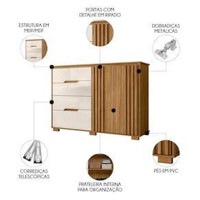 Perfeita para o seu Quarto, esta Cômoda combina estilo e funcionalidade. Dispondo de quatro gavetas com corrediças telescópicas, duas portas com dobradiças metálicas e amortecedor e uma prateleira interna, ela oferece amplo espaço para organizar roupas, acessórios e objetos pessoais, sendo possível também acomodar itens sobre o tampo, complementando a decoração do seu espaço com mais personalidade. O design das gavetas com cava, que dispensa o uso de puxadores, somado ao detalhe ripado das portas adiciona sofisticação ao móvel, tornando-o um ponto de destaque tanto no Quarto do Casal quanto no Quarto de Solteiro. Fabricada em MDP/MDF de 12 e 15mm com acabamento em pintura UV de alta qualidade, ela garante resistência e durabilidade por muito mais tempo aliando praticidade e beleza em um único produto.