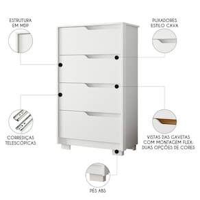 Suas gavetas espaçosas, com puxadores cava, oferecem amplo espaço de armazenamento para seus pertences pessoais, mantendo tudo organizado e sempre ao alcance das mãos. As corrediças telescópicas proporcionam um deslizamento suave e silencioso, garantindo um uso fácil e confortável no dia a dia. Outro grande diferencial desta Cômoda é a possibilidade de personalizar a cor das vistas, graças ao sistema de montagem flex. Essa flexibilidade permite que você adapte o móvel ao seu estilo e à decoração do ambiente, seja no quarto de casal ou no quarto de solteiro. Seu design moderno e clean se encaixa perfeitamente em qualquer espaço, trazendo sofisticação e charme para o seu lar. Combinando durabilidade, funcionalidade e beleza, a Cômoda 4 Gavetas é a adição que falta para transformar o seu quarto. Não perca a chance de adquirir um móvel de excelente qualidade, que oferece praticidade e estilo, com um acabamento impecável, em uma peça que vai durar por muitos anos.