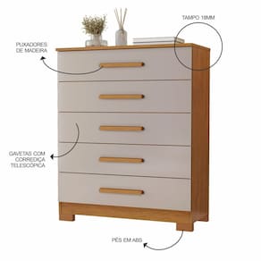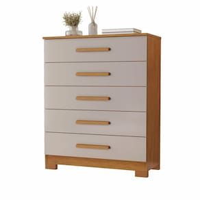 A Cômoda 5 Gavetas Cristina é a solução perfeita para você! Ela combina qualidade, funcionalidade e elegância para transformar seu quarto em um ambiente moderno e organizado. Gavetas que deslizam com corrediças telescópicas garantem uma abertura suave e maior capacidade de carga. Guarde suas roupas, acessórios e objetos pessoais de forma prática e sempre acessível. O tampo de 1,8 cm oferece estabilidade extra, ideal para apoiar itens de decoração ou o que você precisar. Seu design clean harmoniza com diversos estilos de decoração. Produto Montado: Sim Acabamento da Gaveta: Pintura UV Ambiente Principal: Quarto codigo_ean: 7900288197672 Complexidade da Montagem: Baixa: pode ser montado por uma pessoa sozinha Cor: Cinamomo / Off White Cor do Produto: Cinamomo / Off White Escala de Brilho: Fosco Escala de Brilho da Gaveta: Fosco Gaveta com Chave: Não Itens Inclusos: 1 Cômoda, Kit Ferragens e Manual de Montagem Linha ou Coleção: Cristina Manual de Montagem e Instalação: https://product-hub-prd.madeiramadeira.com.br/113584837/documents/575cd300-2892-4ae1-bed6-82372b76e958307880564517527822157956.pdf Marca: JCM Móveis Material da Gaveta: MDP Material do Fundo: HDF Material do Puxador da Gaveta: MDF Material dos Pés: PVC Material Principal: MDP Necessita Montagem: Sim Origem do Produto: Nacional Pés Reguláveis: Não Peso: 40,7 kg Peso Máximo por Gaveta: 8 kg Possui Espelho: Não Possui Nichos: Não Possui Pés: 04 Possui Portas: Não Possui Prateleiras: Não Possui Rodízio: Não Quantidade de Gavetas: 05 Gavetas Recomendações de Uso, Manutenção e Limpeza: Pano Levemente Úmido Sapatas Niveladoras: Não Sistema de Montagem: Parafusos e Minifix Suporta Até (kg): 48 kg Tipo de Cômoda: Adulto Tipo de Corrediça da Gaveta: Metálica Telescópica Tipo de Puxador da Gaveta: Externo