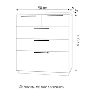 Com um design inovador, esse gaveteiro para quarto é perfeito para transformar seu espaço em um ambiente acolhedor e organizado. Com as cinco gavetas, você terá muito espaço para organizar suas roupas, acessórios e objetos pessoais. Além disso, a profundidade das gavetas é um diferencial da categoria, principalmente a última gaveta estilo gavetão. Já a largura compacta de 90cm permite que você a disponha encaixe facilmente em quarto pequeno ou até mesmo em qualquer cantinho vazio, otimizando o espaço disponível.