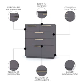 Leve elegância e funcionalidade ao seu quarto com a Cômoda para Quarto 5 Gavetas 90cm Dubai Fendi, Da VLR Móveis.