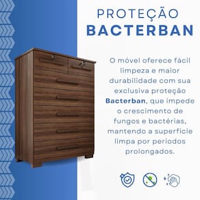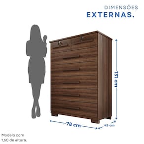 Cômoda com 7 gavetas, fabricada com estrutura de 15mm, garantindo resistência e durabilidade. As chapas em Perfect Wood oferecem alta resistência a fungos e bactérias, garantindo mais higiene e durabilidade. A tecnologia de termo-fusão reforça a estrutura, proporcionando maior resistência ao uso diário. Um material inovador que une qualidade, segurança e longa vida útil. Gavetas espaçosas permitem armazenar roupas, acessórios e diversos itens com praticidade. Duas gavetas possuem chave, proporcionando mais segurança para objetos pessoais. Perfeita para complementar qualquer ambiente com elegância e utilidade. Produto Montado: Sim Acabamento da Gaveta: Melamínico Ambiente Principal: Quarto codigo_ean: 7900288106933 Complexidade da Montagem: Média: pode ser montado por mais de uma pessoa e/ou necessite de maior conhecimento para montagem Cor: Imbuia Cor do Produto: Imbuia Escala de Brilho: Fosco Gaveta com Chave: Sim Itens Inclusos: 1 Cômoda, Manual de Montagem e Kit Ferragens. Linha ou Coleção: Topázio Manual de Montagem e Instalação: https://product-hub-prd.madeiramadeira.com.br/983757/documents/e248534a-9cfc-4537-9ebd-c11d3cea36502775654493817435115460433.pdf Marca: Espresso Móveis Material da Gaveta: MDP Material do Fundo: mdf Material dos Pés: PVC Material Principal: MDP Necessita Montagem: Sim Origem do Produto: Nacional Peso: 47,7 kg Peso Máximo por Gaveta: 3 kg Possui Espelho: Não Possui Nichos: Não Possui Pés: 04 Possui Portas: Não Possui Prateleiras: Não Possui Rodízio: Não Recomendações de Uso, Manutenção e Limpeza: Limpeza com pano macio e levemente umedecido. Não utilizar solventes a base e de inflamáveis. Não utilizar produtos abrasivos. Sapatas Niveladoras: Não Sistema de Montagem: Parafusos e cavilhas Suporta Até (kg): 21 kg Tipo de Corrediça da Gaveta: Metálica Telescópica Tipo de Puxador da Gaveta: Externo