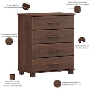 Cor: Café | Altura: 101 cm | Largura: 84 cm | Quantidade de gavetas: 4 | Requer montagem: Sim | Linha: Quarto | Profundidade: 49 cm | Peso: 32 Kg | Com alça: Sim | Com corrediças: Sim | Material das corrediças: Metálico | Com prateleiras: Não | Com rodas: Não | É personalizado: Não | Com bandeja removível: Não | Inclui ferramentas de montagem: Não | Material do cabo: Madeira | Material das dobradiças: na