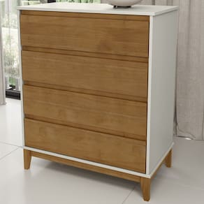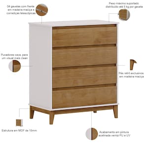 Cada detalhe foi pensado para simplificar sua rotina: desde as 4 gavetas espaçosas com deslize suave para guardar roupas, acessórios ou itens pessoais, passando pela estrutura em MDF resistente e acabamento nobre que garantem durabilidade até os pés em madeira maciça, um contraste perfeito que acrescenta personalidade. Em outras palavras, essa cômoda é ideal para quartos, corredores ou até salas, pois se adapta com naturalidade a qualquer cenário, provando que organização pode ser sinônimo de beleza.