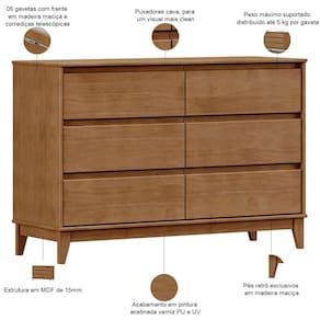Cômoda Para Quarto Closet 6 Gavetas Pés Retrô Cintra F06 Freijó - Lyam Decor - Bege