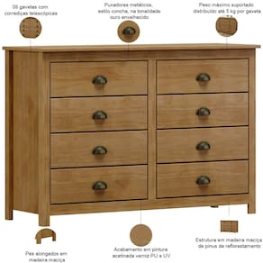 Fabricada em madeira maciça de primeira qualidade, essa cômoda para quarto é um verdadeiro dois-em-um: guarda-roupa secreto e elemento decorativo. Além disso, cada detalhe foi pensado para unir função e estilo - os puxadores em formato de concha adicionam personalidade, enquanto as gavetas de deslize suave acomodam desde roupas íntimas, roupas de cama, mesa e banho até livros preferidos. Por fim, a estrutura robusta e os pés sólidos garantem estabilidade, transformando a organização do dia a dia em uma experiência prazerosa.