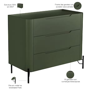 Combinando design orgânico e industrial, essa cômoda moderna traz linhas curvas e pés metálicos, criando um visual único e elegante. Já os puxadores cava garantem um visual clean e contemporâneo, ideal para quartos e closets. Para completar, essa cômoda conta com estrutura robusta, uma vez que é fabricada em 100% MDF, de modo a oferecer durabilidade e resistência, mantendo o charme do seu ambiente por muito mais tempo, enquanto as amplas gavetas dispõem de espaço dinâmico para manter tudo no lugar.
