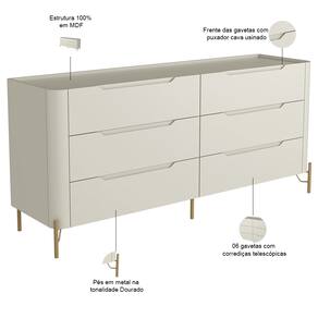 Combinando design orgânico e industrial, essa cômoda moderna traz linhas curvas e pés metálicos, criando um visual único e elegante. Já os puxadores cava garantem um visual clean e contemporâneo, ideal para quartos e closets. Para completar, essa cômoda conta com estrutura robusta, uma vez que é fabricada em 100% MDF, de modo a oferecer durabilidade e resistência, mantendo o charme do seu ambiente por muito mais tempo, enquanto as amplas gavetas dispõem de espaço dinâmico para manter tudo no lugar.