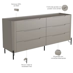 Combinando design orgânico e industrial, essa cômoda moderna traz linhas curvas e pés metálicos, criando um visual único e elegante. Já os puxadores cava garantem um visual clean e contemporâneo, ideal para quartos e closets. Para completar, essa cômoda conta com estrutura robusta, uma vez que é fabricada em 100% MDF, de modo a oferecer durabilidade e resistência, mantendo o charme do seu ambiente por muito mais tempo, enquanto as amplas gavetas dispõem de espaço dinâmico para manter tudo no lugar.