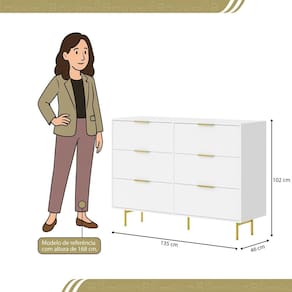 Seja no quarto das crianças ou no seu próprio, a Cômoda Safira oferece espaço, organização e estilo em um só móvel. Produto Montado: Sim Acabamento da Gaveta: Melamínico Acabamento dos Pés: Alumínio Altura dos Pés: 19,5 cm Altura Máxima dos Pés: 19.5000 Ambiente Principal: Quarto codigo_ean: 7900288180971 Complexidade da Montagem: Alta: deve ser montado por um montador especializado Cor: Branco Cor do Produto: Branco Cor Flex: Não Cor Interna: Branco Escala de Brilho: Semi-Brilho Escala de Brilho da Gaveta: Semi-Brilho Gaveta com Chave: Não Informações Complementares: - Fazer uma verificação mensal e realizar o reaperto dos parafusos do produto, caso necessário. - Proibido pular sobre as camas. - O produto destina-se ao uso de uma pessoa por cama sempre. O produto jamais deverá ser utilizado por mais de uma pessoa por cama Itens Inclusos: 1 Cômoda, Kit de Ferragens e Manual de Montagem Linha ou Coleção: Safira Manual de Montagem e Instalação: https://product-hub-prd.madeiramadeira.com.br/614388986/documents/54ac50fb-dd61-4b5a-ac32-e247d7c390fa2932285390317473277797918.pdf Marca: DRD Móveis Material da Gaveta: MDP Material do Puxador da Gaveta: Metal Material dos Pés: Metal Material Principal: MDP Montagem Flex: Não Necessita Montagem: Sim Origem do Produto: Nacional Pés Reguláveis: Não Peso: 61,5 kg Peso Máximo por Gaveta: 3 kg Possui Espelho: Não Possui Nichos: Não Possui Pés: 05 Possui Portas: Não Possui Prateleiras: Não Possui Rodízio: Não Quantidade de Gavetas: 06 Gavetas Recomendações de Uso, Manutenção e Limpeza: Limpar com pano umedecido, sem adição de produtos químicos. Sapatas Niveladoras: Não Sistema de Montagem: Parafusadeira, trena, chave Philips, parafusos, pregos, cantoneira e cavilhas. Suporta Até (kg): 30 kg Tipo de Cômoda: Adulto Tipo de Corrediça da Gaveta: Metálica Telescópica Tipo de Puxador da Gaveta: Externo Marca: Não Informado