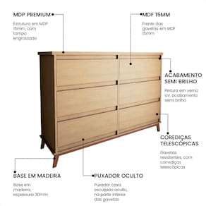 Material: MDP e MDF 15 mm e 12 mm Gaveta não possui reforço em baixo Possui 6 gavetas Corrediças: Telescópicas de Aço Puxador cava esculpidos Material dos pés: Madeira maciça Material da base: Madeira com espessura de 30mm Pintura em Verniz UV semi brilho Peso máximo suportado: - Tampo: 20 kg - Gavetas: 12 kg Garantia: 3 meses contra defeito de fabricação