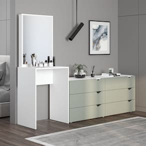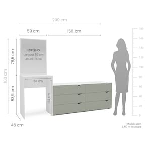 A Cômoda 6 Gavetas Porto da Politorno Móveis é a união perfeita entre design elegante, amplo espaço e funcionalidade para o dia a dia. Com visual moderno e acabamento em pintura UV verde e branco semi fosco, essa peça da Linha Porto é ideal para quem busca sofisticação e praticidade no quarto. Suas medidas generosas — 209 cm de largura, 160 cm de altura e 46 cm de profundidade — garantem excelente capacidade de armazenamento, com 6 gavetas espaçosas que organizam roupas, acessórios e objetos pessoais com facilidade. Produzida em MDP de alta qualidade, oferece durabilidade, resistência e um acabamento fácil de limpar, tornando-se uma solução completa e estilosa para manter seu ambiente sempre bonito e organizado. Produto Montado: Sim Acabamento da Gaveta: Pintura UV Altura do Espelho: 71 cm Ambiente Principal: Quarto codigo_ean: 7900288189264 Complexidade da Montagem: Média: pode ser montado por mais de uma pessoa e/ou necessite de maior conhecimento para montagem Cor: Verde/Branco Cor do Produto: Verde/Branco Cor Interna: Branco Escala de Brilho: Semi-Fosco Escala de Brilho da Gaveta: Semi-Fosco Espessura do Espelho: 3 mm Fita Integrada: Sim Formato do Espelho: Retangular Gaveta com Chave: Não Itens Inclusos: 1 Cômoda, Kit Ferragens, Manual de Montagem e Termo de Garantia Largura do Espelho: 53 cm Linha ou Coleção: Porto Manual de Montagem e Instalação: https://product-hub-prd.madeiramadeira.com.br/405554641/documents/cad19057-046c-4289-a610-a3535f9304973049839622417515695068876.pdf Marca: Politorno Material da Gaveta: MDP Material do Fundo: MDP Material Principal: MDP Necessita Montagem: Sim Origem do Produto: Nacional Peso: 40 kg Peso Máximo por Gaveta: 5 kg Possui Espelho: Sim Possui Nichos: Não Possui Pés: Não Possui Portas: Não Possui Prateleiras: Não Quantidade de Espelho: 01 Recomendações de Uso, Manutenção e Limpeza: Utilize um pano macio umedecido com água e sabão neutro, seguido de pano seco. Não utilize produtos químicos ou abrasivos para limpeza, pois estes danificam o revestimento do móvel. Sapatas Niveladoras: Não Sistema de Montagem: Cavilha, Parafuso, Minifix e prego. Suporta Até (kg): 30 kg Tipo de Corrediça da Gaveta: Metálica Telescópica Tipo de Fixação do Espelho: Fita Dupla Face Tipo de Puxador da Gaveta: Embutido Marca: Não Informado