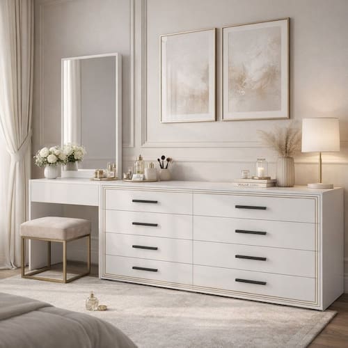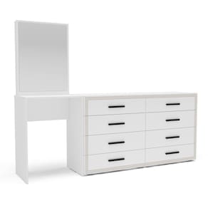A Cômoda Penteadeira Valência 8 Gavetas da Politorno Móveis é a escolha ideal para quem busca máxima organização, elegância e acabamento superior. Com 160 cm de altura, 209,10 cm de largura e 46 cm de profundidade, oferece amplo espaço interno, perfeito para otimizar a rotina com praticidade. Possui puxadores em MDF, que reforçam a robustez e valorizam o design, além de usinagem nas gavetas, um detalhe exclusivo que confere charme e sofisticação ao móvel. O espelho incluso amplia visualmente o ambiente e traz funcionalidade ao dia a dia. As corrediças telescópicas garantem abertura total, suave e silenciosa das gavetas. O acabamento em pintura UV assegura excelente acabamento, durabilidade e fácil limpeza, mantendo o móvel sempre bonito. Uma peça imponente e versátil, com a qualidade Polit