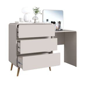 A Cômoda Penteadeira com 03 Gavetas Linha Curve da Completa Móveis apresenta funcionalidade, praticidade e elegância com design arrojado e atemporal! Com cantos arredondados, traz uma leveza ao ambiente. As molduras laterais arredondadas são em MDF, garantindo qualidade superior. Possui três gavetas com corrediças telescópicas e pés plásticos. Penteadeira contemporânea com espelho em cantos arredondados. Um verdadeiro charme pra maquiagem perfeita! O produto é entregue desmontado. Acabamento da Gaveta: BP Acompanha Banqueta: Não Altura do Espelho: 45 cm Altura dos Pés: 16 cm Ambiente Principal: Quarto codigo_ean: 7900288244307 Complexidade da Montagem: Baixa: pode ser montado por uma pessoa sozinha Cor: Bege Dunas Cor do Produto: Bege Dunas Cor Interna: Bege Escala de Brilho: Fosco Escala de Brilho da Gaveta: Fosco Espessura do Espelho: 3 mm Formato do Espelho: Retangular com cantos superiores arredondados Gaveta com Chave: Não Itens Inclusos: 1 Cômoda, Kit Ferragens e Manual de Montagem Largura do Espelho: 54 cm Linha ou Coleção: Curve Manual de Montagem e Instalação: https://product-hub-prd.madeiramadeira.com.br/793726087/documents/632655a6-44eb-4244-95d7-cc516329c31e3239351522917588876602988.pdf Marca: Completa Móveis Material da Gaveta: MDP Material dos Pés: Plástico Material Principal: MDP Necessita Montagem: Sim Origem do Produto: Nacional Peso: 44,4 kg Peso Máximo por Gaveta: 4 kg Possui iluminação: Não Possui Pés: 04 Possui Porta Objetos: Sim Possui Portas: Não Possui Prateleiras: Não Possui Rodízio: Não Possui Vidro: Não Quantidade de Espelho: 01 Recomendações de Uso, Manutenção e Limpeza: Use um pano levemente umedecido com água, seguido de pano seco. Não utilize produtos químicos ou abrasivos. Sapatas Niveladoras: Não Sistema de Montagem: Sistema de montagem via parafusos, cavilhas e kit minifix. Suporta Até (kg): 27 kg Tipo de Corrediça da Gaveta: Metálica Telescópica Tipo de Fixação do Espelho: Fita Dupla Face Tipo de Puxador da Gaveta: Embutido