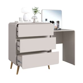 Comoda Penteadeira com Espelho 3 Gavetas e Pes Curve Completa Moveis A Comoda Penteadeira com 03 Gavetas Linha Curve da Completa Moveis apresenta funcionalidade, praticidade e elegancia com design arrojado e atemporal! Com cantos arredondados, traz uma leveza ao ambiente. As molduras laterais arredondadas sao em MDF, garantindo qualidade superior. Possui tres gavetas com corredicas telescopicas e pes plasticos. Penteadeira contemporanea com espelho em cantos arredondados. Um verdadeiro charme pra maquiagem perfeita! O produto e entregue desmontado.