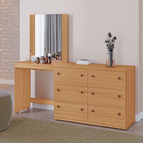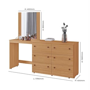 MDFConheça a Comoda Penteadeira Marília, o epítome do glamour e praticidade! Fabricada em 100% MDF de alta qualidade, garante durabilidade e sofisticação. Equipada com seis gavetas e um nicho, oferece amplo espaço de armazenamento para seus itens de beleza. Seu espelho adiciona um toque de elegância e funcionalidade ao espaço. Ideal para criar um cantinho de beleza digno de uma diva. Adquira agora e eleve sua rotina de cuidados pessoais!