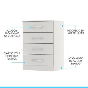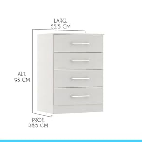 Cômoda Pequena Para Quarto 55x93cm Mdp Branco Menu Móveis Branco Voce merece o melhor quando se trata de moveis para sua casa e a escolha certa para atender todas as suas necessidades. Com um design atual, une versatilidade, conforto e beleza. Com quatro gavetas, voce tera muito espaco para manter tudo organizado e ao alcance das maos. Produzida com materiais de excelente qualidade, garantindo a sua resistencia ao desgaste diario e mantendo sua beleza e funcionalidade por muito tempo. O melhor em moveis no design atual aliando conforto, qualidade e otimos precos, so na Menu Moveis! Caracteristicas: Modelo: Pequena Marca: Menu Moveis Material: Produzido em MDP de 12 mm Acabamento: UV Gavetas: 04 Corredica: Plastica Puxadores: Alca em ABS na cor Prata