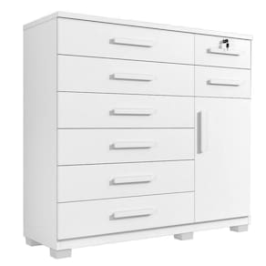 Cômoda Pernambuco 8 Gavetas 1 Porta Com Sapateira - Benetil Branco A Comoda Pernambuco complementa seu quarto com charme e sofisticacao, combinando praticidade e beleza. Com oito gavetas espacosas, sendo uma com chave para maior seguranca, oferece organizacao e seguranca para seus itens pessoais. Suas corredicas telescopicas proporcionam suavidade e resistencia no uso diario. Conta ainda com uma porta e prateleira interna, formando uma sapateira bem estruturada. Fabricada em chapa de 15 mm, garante durabilidade e robustez superiores. Com a tecnologia MDP Perfect, alia sustentabilidade e inovacao, proporcionando longa vida util e facil manutencao. A pintura UV de alta resistencia e facil de limpar e ecologicamente correta, feita com madeira de reflorestamento para uma escolha mais sustentavel. Caracteristicas: Material Principal: Mdp Espessura Da Chapa: 15 Mm Escala De Brilho: Semi Brilho Acabamento: Pintura UV Sistema De Montagem: Parafuso, Cavilha E Cantoneiras Metalicas Quantidade de Gavetas: 08 Quantidade de Portas: 01
