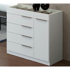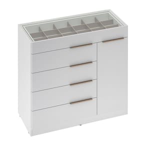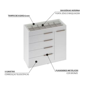 Comoda Porta Joia Tampo Vidro 5 Gavetas Lume, complemento ideal para seu quarto, oferecendo muita beleza e originalidade ao seu ambiente. Estrutura em MDP de 12 e 15 mm, com acabamento em pintura UV. Composta por 01 porta com dobradiças metálicas e prateleira interna removível, 05 gavetas com corrediças telescópicas que garantem suavidade ao abrir e fechar, a primeira gaveta conta divisória colmeia para você armazenar seus acessórios ou maquiagens e tampo em vidro, para visualizar todos os itens, com puxadores metálicos garantindo um visual requintado e elegante. Amplas dimensões e capacidade de armazenamento, desenvolvida para oferecer total conforto e comodidade para você. Este móvel chegará na sua casa separado em 03 volumes.