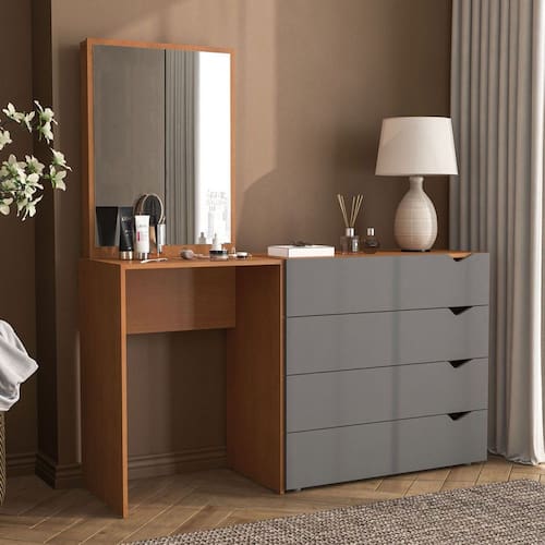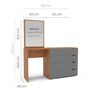 O(a) Cômoda Porto 4 Gavetas com Espelho Cinza/Freijó - Politorno é produzido em MDP na escala de brilho Semi-Fosco, e possui um grau de dificuldade de montagem: Fácil.