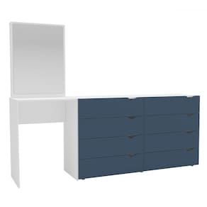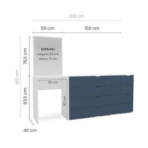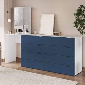 O(a) Cômoda Porto 8 Gavetas com Espelho Azul/Branco - Politorno é produzido em MDP na escala de brilho Semi-Fosco, e possui um grau de dificuldade de montagem: Médio.