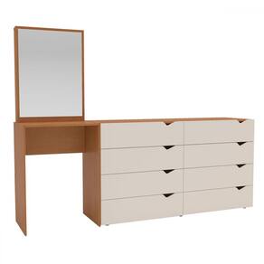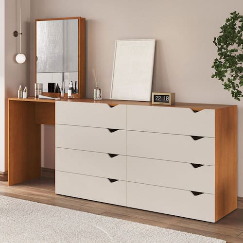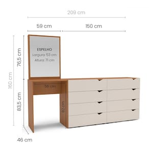 O(a) Cômoda Porto 8 Gavetas com Espelho Creme/Freijó - Politorno é produzido em MDP na escala de brilho Semi-Fosco, e possui um grau de dificuldade de montagem: Médio.