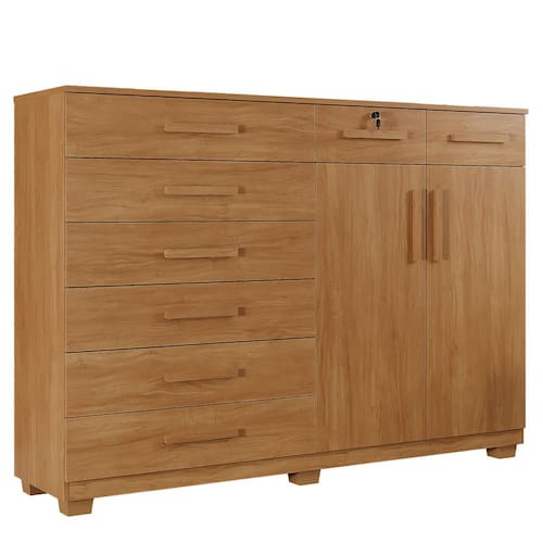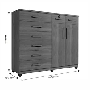 A Cômoda Portugal é a escolha perfeita para completar seu quarto com charme e elegância, oferecendo uma ampla capacidade de organização e um toque sofisticado. Com oito gavetas espaçosas, incluindo uma com chave para segurança, suas corrediças telescópicas garantem suavidade e resistência no uso diário, tornando-a prática e segura. Além disso, conta com duas portas e duas prateleiras internas que formam uma sapateira bem definida, otimizando o espaço de forma eficiente. O tampo robusto de 15 mm assegura durabilidade e resistência. Produzida com a linha MDP Perfect, essa cômoda combina sustentabilidade e inovação tecnológica, garantindo fácil manutenção e longa vida útil. A pintura UV de alta resistência é fácil de limpar e ecologicamente correta, utilizando madeira de reflorestamento, contribuindo para a preservação ambiental.