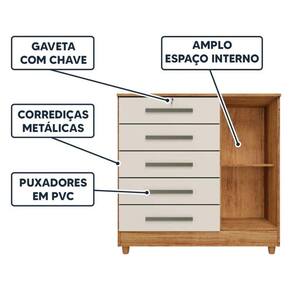 Armazenamento versátil: 1 porta de bater e 5 gavetas externas com corrediças metálicas, incluindo 1 gaveta com fechadura para maior segurança.