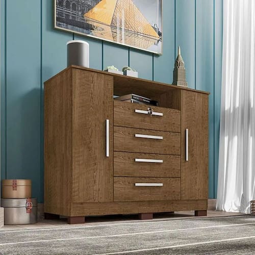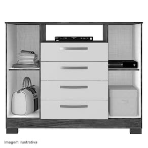 Um projeto desenvolvido para comportar em um único móvel a capacidade de atender diversas funções, tais como: cômoda para o quarto para guardar suas roupas, na 1ª gaveta fechadura com chave para acomodação de joias e pertences de valor. Rack podendo acomodar a televisão no tampo. Trazendo a organização e o visual em verdadeira sintonia, todo conforto que a sua família merece.