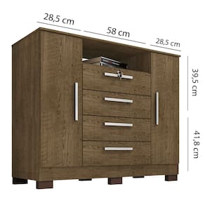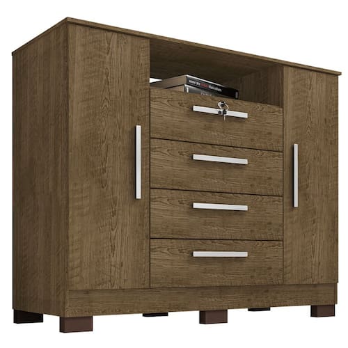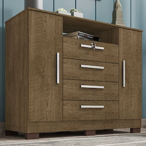 Apresentamos a Cômoda Rack com 2 Porta e 4 Gavetas Madri, uma móvel elegante e funcional para complementar seu ambiente com estilo e organização. Possui 1 fechadura com chave apenas na primeira gaveta. Estrutura em MDP de 12mm. Gavetas espaçosas equipadas com corrediças telescópicas, garantindo um deslizamento suave e silencioso, suas 2 portas equipadas com dobradiças metálicas. Puxadores em ABS, enquanto os pés de plástico proporcionam estabilidade e resistência. Além disso, a pintura UV texturizada oferece um acabamento impecável, realçando a durabilidade e beleza do móvel. Ideal para quem busca praticidade sem abrir mão do design. Este móvel chegará na sua casa separado em 01 volume.