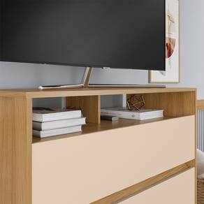 A funcionalidade da Cômoda Rack Atlas é um dos seus principais atrativos. Além de servir como uma excelente cômoda, ela pode ser utilizada como rack, suportando aparelhos eletrônicos e objetos decorativos. Sua estrutura resistente e acabamentos de alta qualidade asseguram durabilidade e um visual sempre impecável, tornando este móvel indispensável para qualquer quarto.