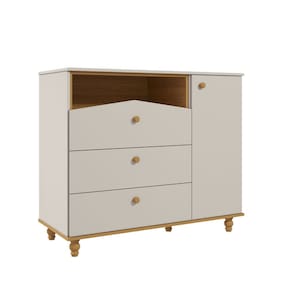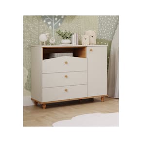 Seguindo o estilo lúdico, essa cômoda é perfeita para quem precisa de bastante espaço para organizar o enxoval dos pequenos.Possui nicho superior para organizar objetos de uso diário e 03 gavetas grandes com corrediças telescópicas que proporcionam deslizamento suave, maior abertura e melhor acesso às roupas. Possui também 01 porta de abrir com prateleira interna e 01 cabideiro para você montar de acordo com sua necessidade. Os puxadores e pés são torneados em madeira maciça e conferem um charme especial ao produto.O tampo possui bordas arredondadas que recebem pintura em laca com tinta atóxica e as peças retas recebem pintura UV também com tinta e verniz atóxicos.Fabricada com matéria-prima 100% MDF, um material ecologicamente correto e de ótima durabilidade e resistência.