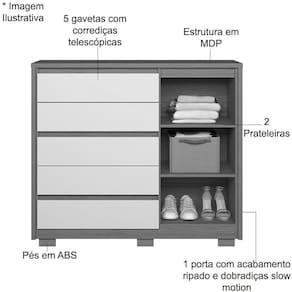 Característica da Cômoda Sapateira: - Estrutura em MDP; - Acabamento de pintura em UV; - Tampo e molduras de 25 mm; - 1 porta com acabamento ripado e dobradiças slow motion; - 5 Gavetas com corrediças telescópicas; - Puxadores em MDF revestidos; - 6 pés em ABS; - 2 prateleiras; - Não acompanha itens de decoração ou quaisquer objetos fora o móvel na imagem; - Imagens interna meramente ilustrativa para ver a divisão do produto;