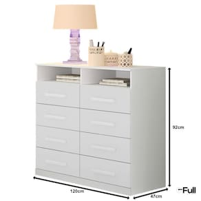 Com oito gavetas espaçosas, você terá muito espaço para guardar roupas, eletrônicos, livros e outros itens, mantendo seu ambiente organizado.