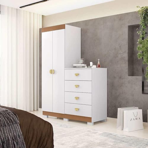 "A Cômoda Roupeiro Cristal é a solução perfeita para quem busca praticidade e versatilidade no armazenamento de pertences. Ela conta com 4 gavetas com corrediças telescópicas para maior resistência e duas portas com prateleiras internas, ideal para roupas dobradas, calçados e acessórios