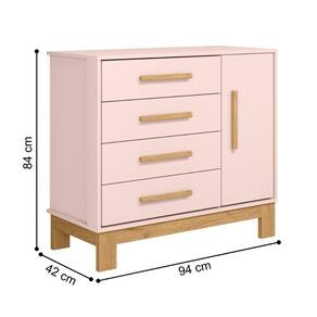 A cômoda é feita em MDP 15mm, possuindo quatro gavetas com corrediças metálicas, uma porta e seis prateleiras com amplo espaço para organizar sapatos e roupas.