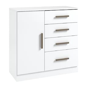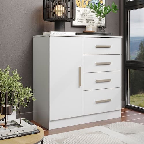 Comoda com uma porta, uma prateleira e quatro gavetas, com corredicas telescopicas e puxadores modernos com designer inovador. Confeccionada com materiais de alta qualidade.