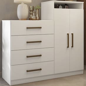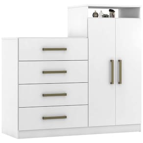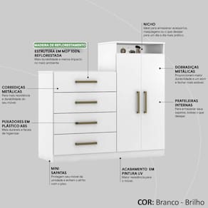 Comoda Sapateira 2 Portas 4 Gavetas 4270, é um produto espaçoso, com design moderno que traz praticidade para seu dia a dia. Estrutura em MDP de 12 e 15 mm, com acabamento em pintura UV. Composta por amplo tampo para acomodar uma decoração especial, nicho para armazenar seus acessórios mais utilizados, 2 portas articuladas com dobradiças metálicas e 2 prateleiras internas, 4 gavetas com corrediças metálicas, puxadores são em plástico ABS mais duráveis e fácil de limpar, e acompanha sapatas plásticas. Além de ampla capacidade de armazenamento, foi desenvolvido para oferecer total conforto e comodidade para você. Este móvel chegará na sua casa separado em 01 volume.
