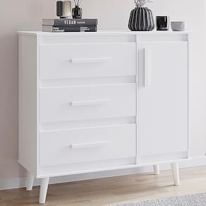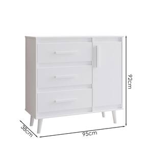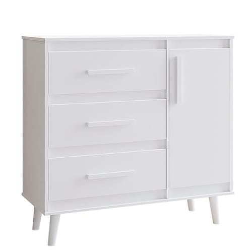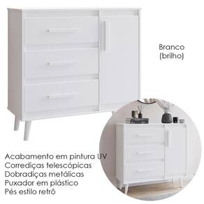 Cômoda Sapateira Mila, ideal para compor quartos com modernidade e elegância. Produzida em MDP (12/15mm) com acabamento em pintura UV. Conta com 03 gavetas, 01 porta, prateleira interna, corrediças telescópicas, dobradiças metálicas, puxadores em plástico e pés estilo retrô. Este produto será entregue em 01 volume.