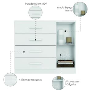 DIFERENCIAL: Quatro gavetas espaçosas; Puxadores em MDF; Espaço para calçados