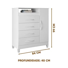 Dimensões da Cômoda: Largura 84 cm; Profundidade 40 cm; Altura 99 cm.