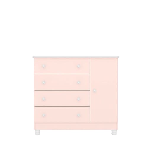 As quatro gavetas com corrediças metálicas e excelente profundidade proporcionam organização impecável para suas roupas e acessórios. Os puxadores duplos em formato de estrela, feitos de poliestireno, adicionam um toque mágico ao móvel, tornando cada momento especial.