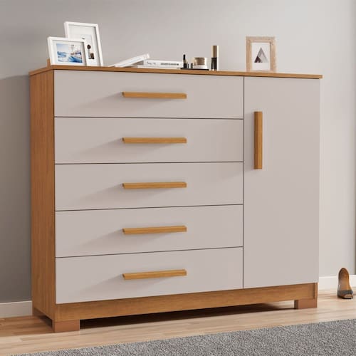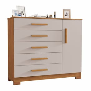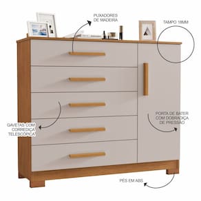 A Cômoda Sapateira 5 Gavetas Pietra é a solução perfeita para você! Ela combina qualidade, funcionalidade e elegância para transformar seu quarto em um ambiente moderno e organizado. Gavetas que deslizam com corrediças telescópicas garantem uma abertura suave e maior capacidade de carga. Guarde suas roupas, acessórios e objetos pessoais de forma prática e sempre acessível. O tampo de 1,8 cm oferece estabilidade extra, ideal para apoiar itens de decoração ou o que você precisar. Seu design clean harmoniza com diversos estilos de decoração. Produto Montado: Sim Acabamento da Gaveta: Pintura UV Acabamento da Porta: Pintura UV Acabamento da Prateleira: Pintura UV Ambiente Principal: Quarto codigo_ean: 7900288196590 Complexidade da Montagem: Baixa: pode ser montado por uma pessoa sozinha Cor: Cinamomo / Off White Cor do Produto: Cinamomo / Off White Escala de Brilho: Fosco Escala de Brilho da Gaveta: Fosco Escala de Brilho da Porta: Fosco Escala de Brilho da Prateleira: Fosco Gaveta com Chave: Não Itens Inclusos: 1 Cômoda, Kit Ferragens e Manual de Montagem Linha ou Coleção: Pietra Manual de Montagem e Instalação: https://product-hub-prd.madeiramadeira.com.br/881904252/documents/36ad64e1-9b0c-42c9-b18e-ea56b2a75396307863864517527771792458.pdf Marca: JCM Móveis Material da Gaveta: MDP Material da Porta: MDP Material da Prateleira: MDP Material do Fundo: HDF Material do Puxador da Gaveta: MDP Material do Puxador da Porta: MDF Material dos Pés: PVC Material Principal: MDP Necessita Montagem: Sim Origem do Produto: Nacional Peso: 53,55 kg Peso Máximo por Gaveta: 8 kg Peso Máximo por Prateleira: 8 kg Possui Espelho: Não Possui Nichos: Não Possui Pés: 04 Possui Portas: Sim Possui Prateleiras: Sim Possui Rodízio: Não Quantidade de Gavetas: 05 Gavetas Quantidade de Prateleiras: 01 Prateleira Recomendações de Uso, Manutenção e Limpeza: Pano Levemente Úmido Sapatas Niveladoras: Não Sistema de Montagem: Parafusos e Minifix Suporta Até (kg): 64 kg Tipo de Cômoda: Adulto Tipo de Corrediça da Gaveta: Metálica Telescópica Tipo de Dobradiça/Corrediça da Porta: Metálica Tipo de Porta: Bater Tipo de Puxador da Gaveta: Externo Tipo de Puxador da Porta: Externo
