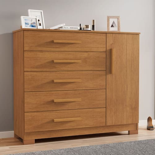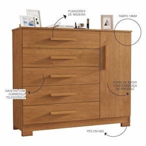 A Cômoda Sapateira 5 Gavetas Pietra é a solução perfeita para você! Ela combina qualidade, funcionalidade e elegância para transformar seu quarto em um ambiente moderno e organizado. Gavetas que deslizam com corrediças telescópicas garantem uma abertura suave e maior capacidade de carga. Guarde suas roupas, acessórios e objetos pessoais de forma prática e sempre acessível. O tampo de 1,8 cm oferece estabilidade extra, ideal para apoiar itens de decoração ou o que você precisar. Seu design clean harmoniza com diversos estilos de decoração. Produto Montado: Sim Acabamento da Gaveta: Pintura UV Acabamento da Porta: Pintura UV Acabamento da Prateleira: Pintura UV Ambiente Principal: Quarto codigo_ean: 7900288196583 Complexidade da Montagem: Baixa: pode ser montado por uma pessoa sozinha Cor: Cinamomo Cor do Produto: Cinamomo Escala de Brilho: Fosco Escala de Brilho da Gaveta: Fosco Escala de Brilho da Porta: Fosco Escala de Brilho da Prateleira: Fosco Gaveta com Chave: Não Itens Inclusos: 1 Cômoda, Kit Ferragens e Manual de Montagem Linha ou Coleção: Pietra Manual de Montagem e Instalação: https://product-hub-prd.madeiramadeira.com.br/702965115/documents/d46bf601-f691-408f-a3ff-559c03a48bb1307863864517527771792458.pdf Marca: JCM Móveis Material da Gaveta: MDP Material da Porta: MDP Material da Prateleira: MDP Material do Fundo: HDF Material do Puxador da Gaveta: MDP Material do Puxador da Porta: MDF Material dos Pés: PVC Material Principal: MDP Necessita Montagem: Sim Origem do Produto: Nacional Peso: 53,55 kg Peso Máximo por Gaveta: 8 kg Peso Máximo por Prateleira: 8 kg Possui Espelho: Não Possui Nichos: Não Possui Pés: 04 Possui Portas: Sim Possui Prateleiras: Sim Possui Rodízio: Não Quantidade de Gavetas: 05 Gavetas Quantidade de Prateleiras: 01 Prateleira Recomendações de Uso, Manutenção e Limpeza: Pano Levemente Úmido Sapatas Niveladoras: Não Sistema de Montagem: Parafusos e Minifix Suporta Até (kg): 64 kg Tipo de Cômoda: Adulto Tipo de Corrediça da Gaveta: Metálica Telescópica Tipo de Dobradiça/Corrediça da Porta: Metálica Tipo de Porta: Bater Tipo de Puxador da Gaveta: Externo Tipo de Puxador da Porta: Externo