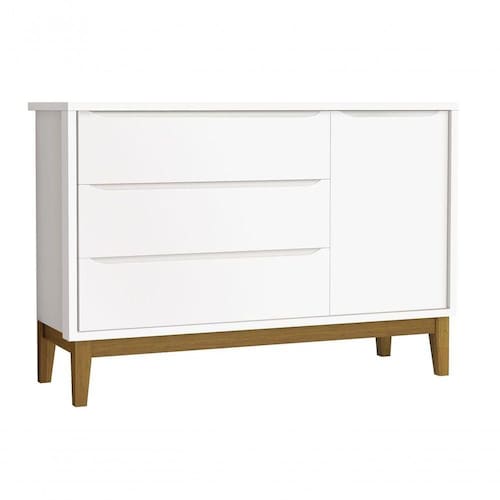 Evidênciando um ar retrô com o modelo de seus pés em madeira maciça, a Cômoda Sapateira Classic New - MóveisAqui possui um desing clean que combina com vários estilos de decoração. É perfeita para a organização das roupinhas e acessórios do seu baby, proporciona um espaço para armazenamento e com divisória interna, para que a organização do dia-a-dia possa ser mais fácil. Possui puxadores embutidos, as aberturas ocorrem através de recortes no MDF que possibilitam o perfeito encaixe da mão para que possa abrir as portas e gavetas.
