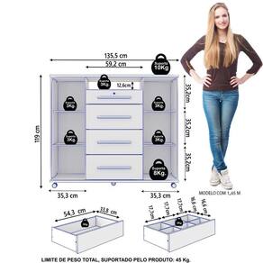 Certifique-se de tudo antes de finalizar a compra, evitando assim futuros desagrados ou imprevistos com a . MEDIDAS:: A = 119 cm L = 135 cm P = 44,8 cm | PESO:: 72,5 Kg | PESO SUPORTADO:: 45 Kg | GAVETAS SUPORTAM ATÉ:: 3 Kg | PRATELEIRAS SUPORTAM:: 3 Kg | TAMPO SUPORTA:: 10 Kg | MODELO:: Cômoda Sapateira e Chave 4 Gavetas 2 Portas Versátil | MARCA:: Zanzini | QUANTIDADE DE GAVETAS:: 4 | QUANTIDADE DE PORTAS:: 2 | TIPO DE PORTA:: Bater | QUANTIDADE DE PRATELEIRAS:: 4 | MATERIAL DE DOBRADIÇA:: Metal | MATERIAL DA ESTRUTURA:: MDP | ESPESSURA DO MATERIAL DA ESTRUTURA:: 12mm | TIPO DE PINTURA:: Semi fosco | ACABAMENTO:: UV Verniz | QUANTIDADE DE PUXADORES:: 6 | MATERIAL DO PUXADOR:: MDF | TIPO DE PUXADOR:: Parafusado | CORREDIÇAS:: Telescópicas | RODÍZIOS:: 6 | DIFERENCIAL:: Puxadores em MDF; Gavetas espaçosas com divisórias e chave; Espaço para calçados | ITENS INCLUSOS:: 1 Cômoda, 1 Manual de Montagem, 1 Kit Parafusos | SISTEMA DE MONTAGEM:: Parafusos auto atarraxantes, cola, cavilhas, pregos | GARANTIA:: 3 Meses | AVISO:: A Esplanada Móveis se responsabiliza pela dos produtos adquiridos até a porta de entrada ou portaria do indicado, se a portaria do condomínio permitir, as são efetuadas no piso térreo e é de responsabilidade do cliente. | ALTURA: 119 | LARGURA: 135 | TIPO DO MÓVEL: CÔMODA | QUANTIDADE DE CAIXAS DE EMBALAGEM: 1 | REQUER MONTAGEM: SIM | PROFUNDIDADE: 44,8 Cor: Branco