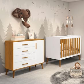 Funcional e encantadora, possui 4 gavetas com puxadores em madeira, 1 porta com prateleira interna, sistema antitombamento e amplo espaço para organizar as roupas do bebê.